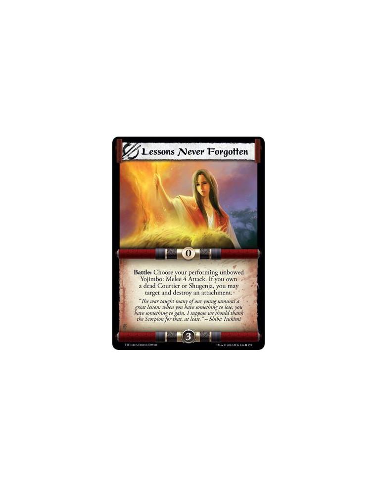 Lessons Never Forgotten  - Battle: Choose your Performing unbowed Yojimbo: Melee 4 Attack. If you own a dead Courtier or Shugenj