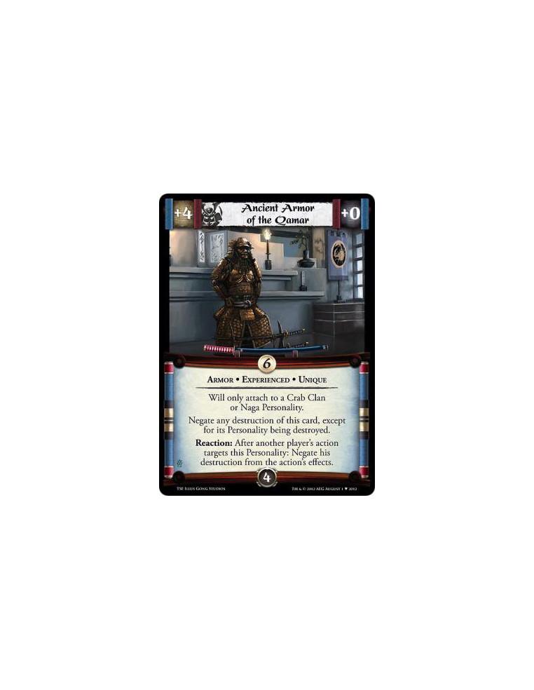 Will only attach to a Crab Clan or Naga Personality. Negate any destruction of this card, except for its Personality being destroyed. Reaction: After another player's action targets this Personality: Negate his destruction from the action's effects.