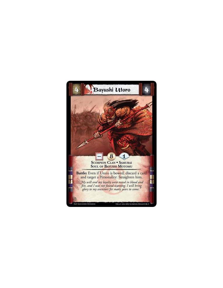 Bayushi Utoro  - Scorpion Clan • Samurai • Soul of Bayushi MotomuBattle: Even if Utoro is bowed, discard a card and target a Per
