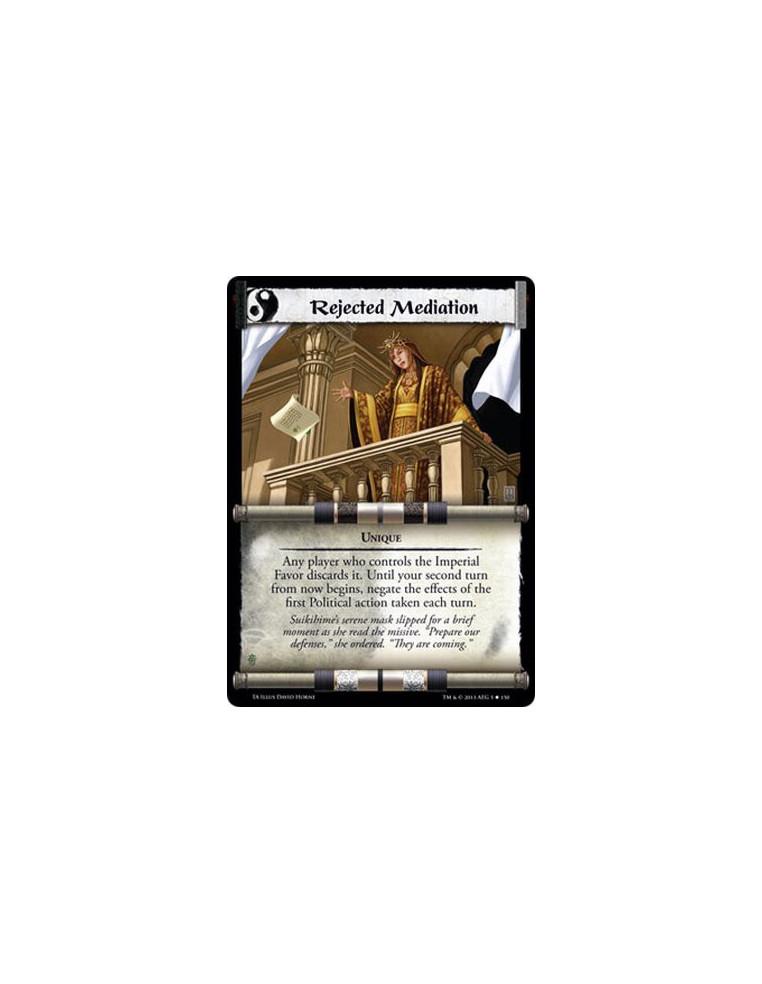 Rejected Mediation  - UniqueAny player who controls the Imperial Favor discards it.   Until your second turn from now begins, ne