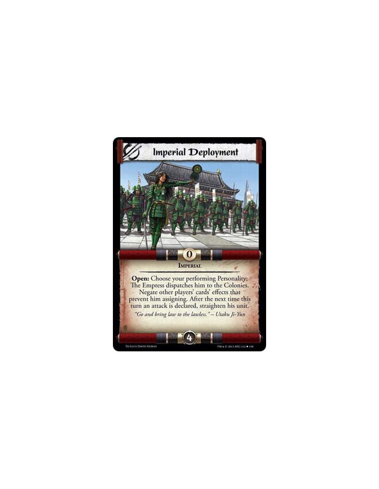 Open: Choose your performing Personality: The Empress dispatches him to the Colonies. Negate other players' cards' effects that prevent him from assigning. After the next time this turn an attack is declared, straighten his unit.