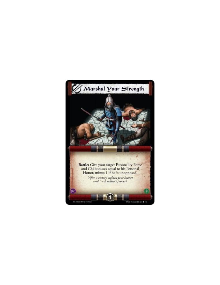 Focus Effect: Before this duel’s resolution, negate all bonuses to each focused card’s Focus Value. Battle: Target your unbowed Samurai Personality: Target an enemy Personality. After this Combat Segment ends, reduce his Force to 0.