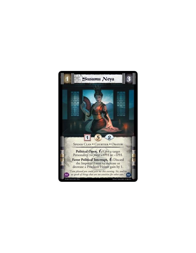 Susumu Neya  - Spider Clan  • Courtier • OratorPolitical Open, w: Give a target Personality (in play) +1PH or -1PH. Favor Politi