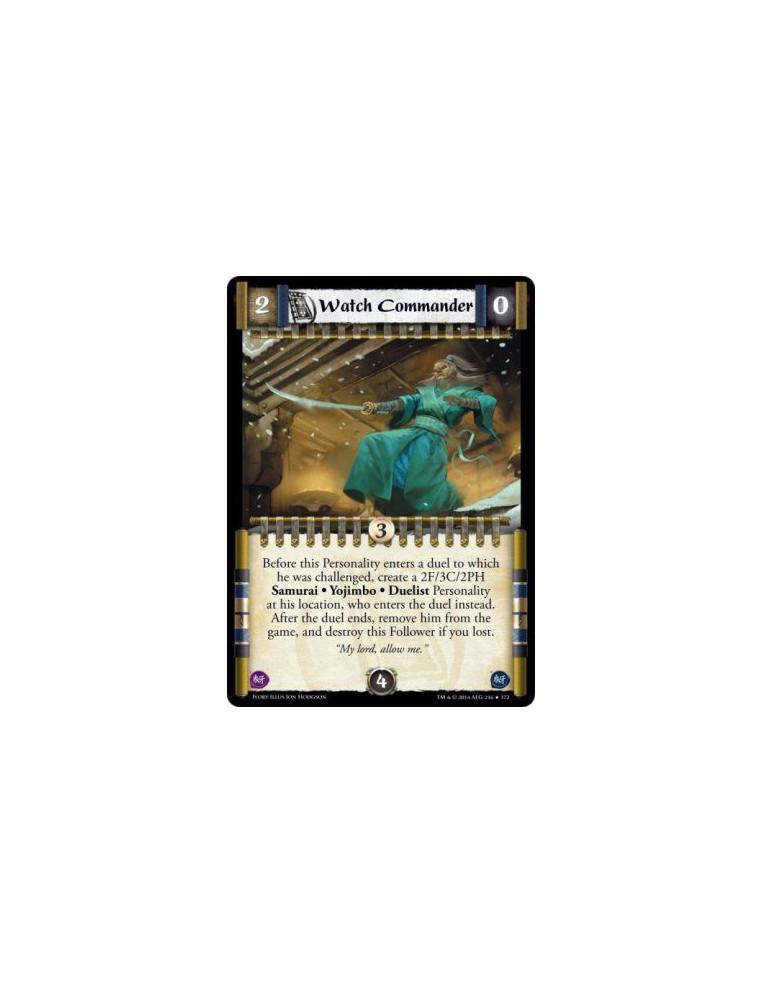 Before this Personality enters a duel to which he was challenged, create a 2F/3C/2PH Samurai • Yojimbo • Duelist Personality at his location, who enters the duel instead. After the duel ends, remove him from the game, and destroy this Follower if you lost.