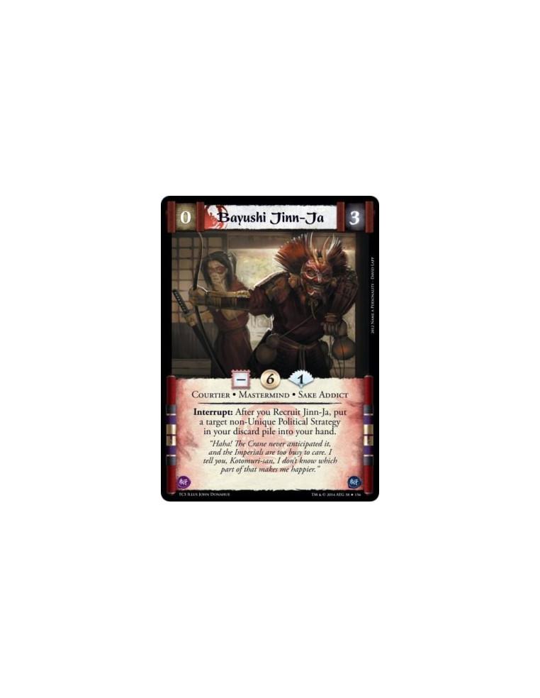 Bayushi Jinn-Ja FOIL  - Courtier • Mastermind • Sake AddictInterrupt: After you Recruit Jinn-Ja, put a target non-Unique Politic