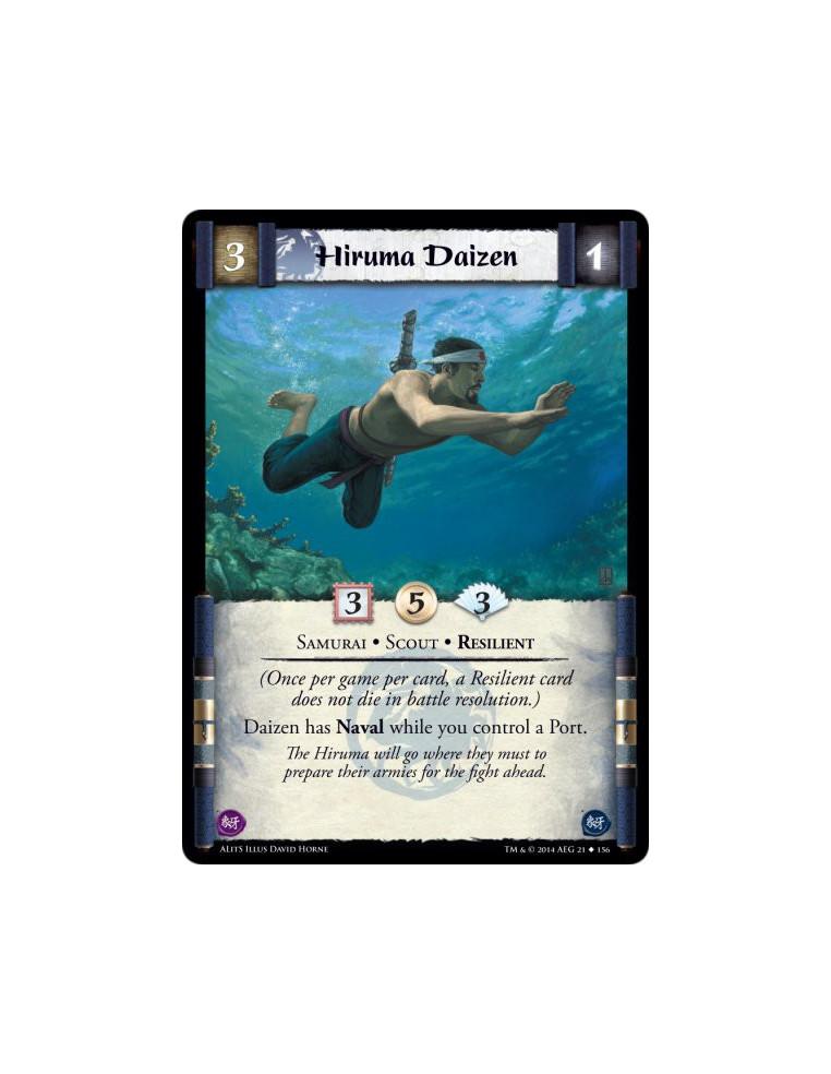 Hiruma Daizen  - Resilient • Samurai • Scout(Once per game per card, a Resilient card does not die in battle resolution.)Daizen