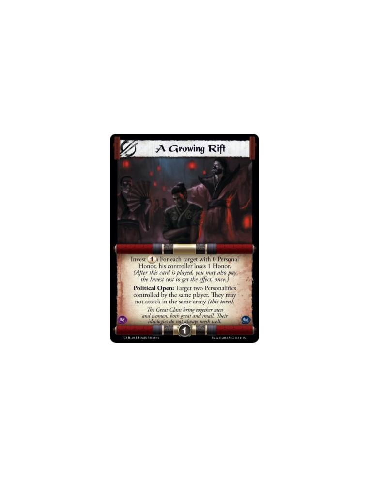 A Growing Rift  - Invest 1: For each target with 0 Personal Honor, his controller loses 1 Honor. (After this card is played, you