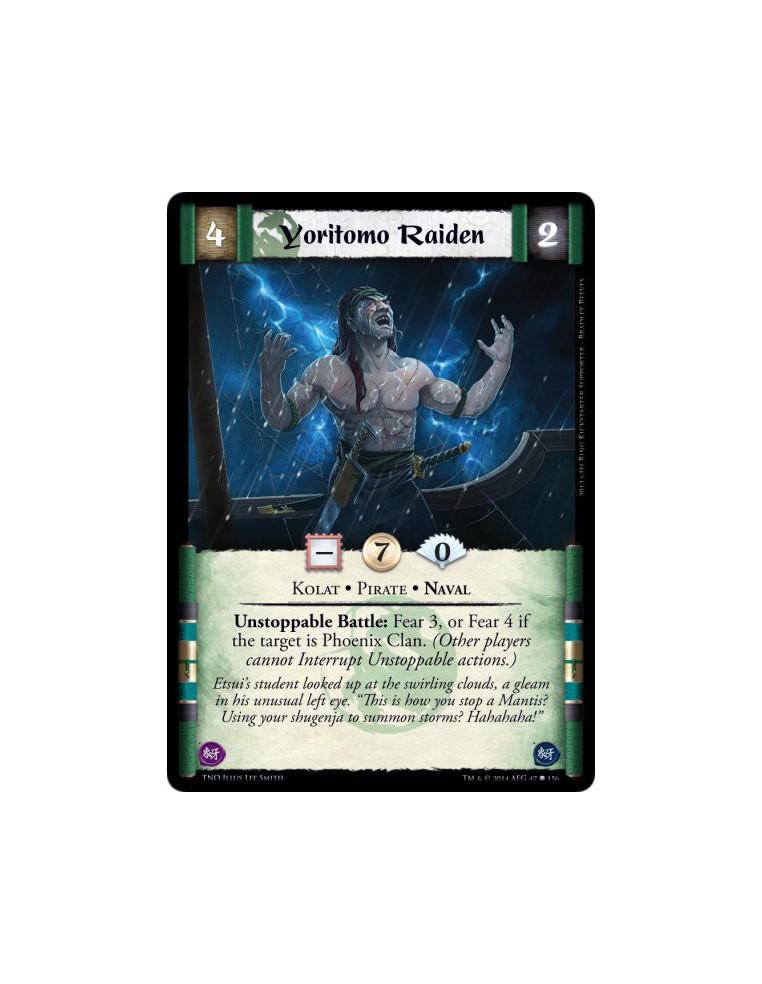 Yoritomo Raiden  - Kolat • Pirate • NavalUnstoppable Battle: Fear 3, or Fear 4 if the target is Phoenix Clan. (Other players can