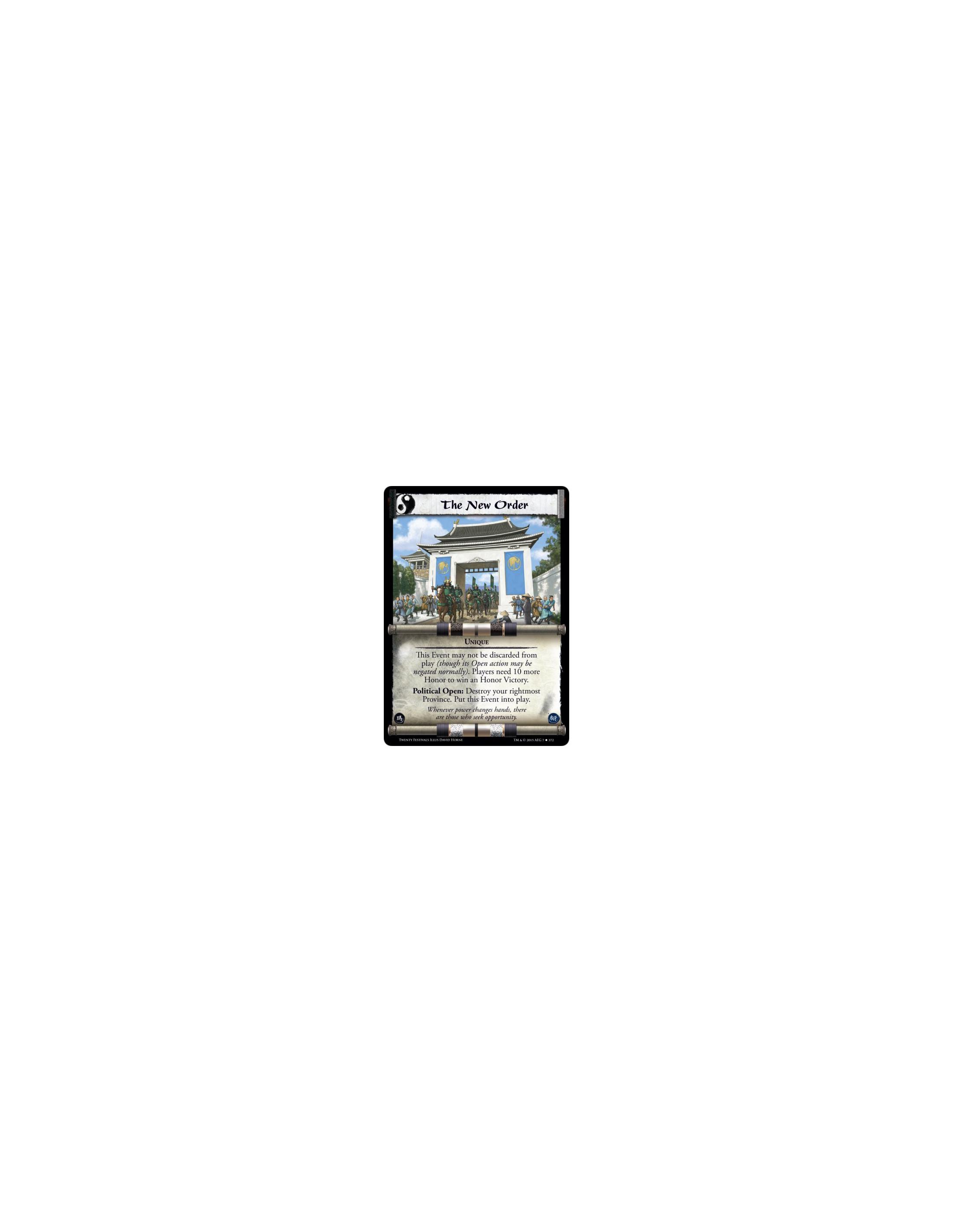The New Order  - UniqueThis Event may not be discarded from play (though its Open action may be negated normally). Players need