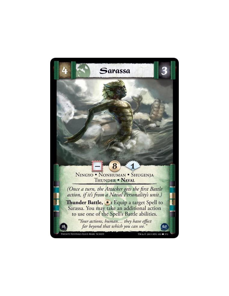 Sarassa  - Nonhuman • Thunder • Naval • Shugenja • Ningyo      (Once a turn, the Attacker gets the first Battle action, if it's