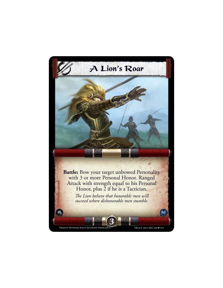 A Lion's Roar  - Battle: Bow your target unbowed Personality with 3 or more Personal Honor. Ranged Attack with strength equal to