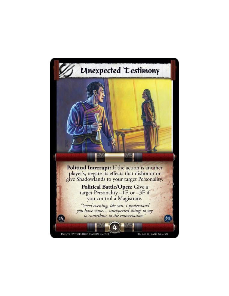 Unexpected Testimony  -     Political Interrupt: If the action is another player's, negate its effects that dishonor or give Sha