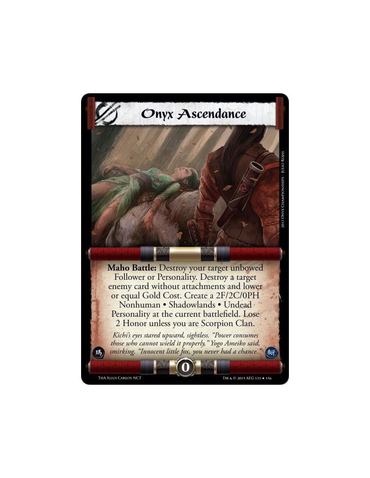 Maho Battle: Destroy your target unbowed Follower or Personality. Destroy a target enemy card without attachments and lower or equal Gold Cost. Create a 2F/2C/0PH Nonhuman • Shadowlands • Undead Personality at the current battlefield. Lose 2 Honor unless you are Scorpion Clan.