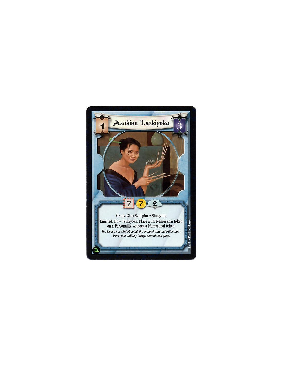 Asahina Tsukiyoka  - Crane Clan Sculptor. Shugenja Limited: Bow Tsukiyoka. Place a 1C Nemuranai token on a Personality without a