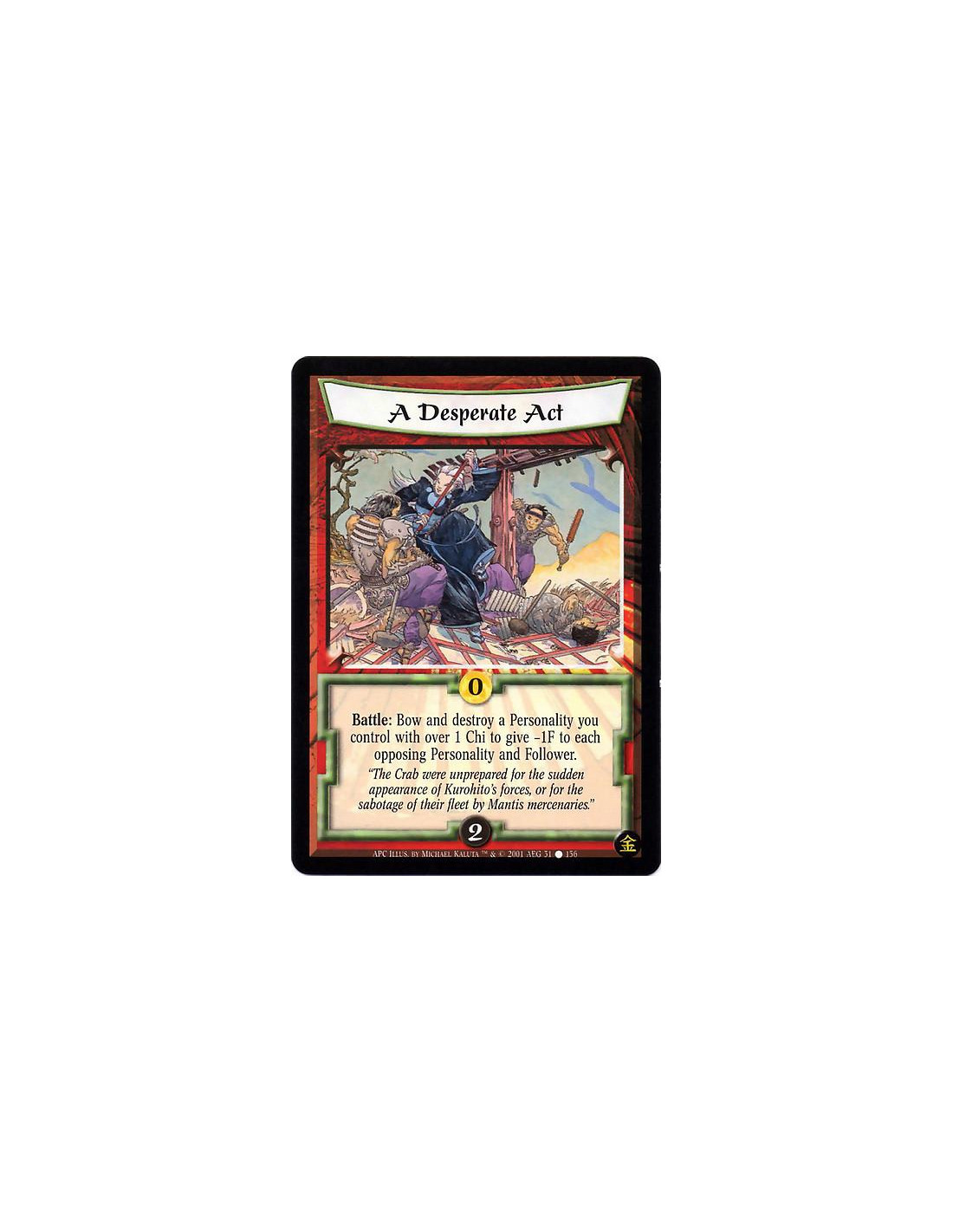 A Desperate Act  - Battle: Bow and destroy a Personality you control with over 1 Chi to give -1F to each opposing Personality an
