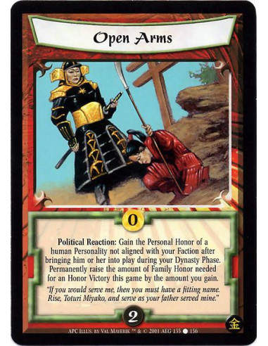 Political Reaction: Gain the Personal Honor of a human Personality not aligned with your Faction after bringing him or her into play during your Dynasty Phase. Permanently raise the amount of Family Honor needed for an Honor Victory this game by the amount you gain.
