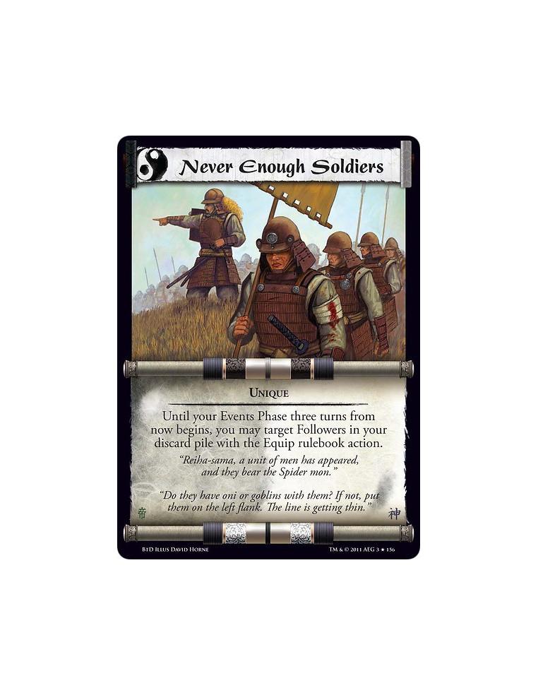 Never Enough Soldiers (Spanish)  - UniqueUntil your Events Phase three turns from now begins, you may target Followers in your d