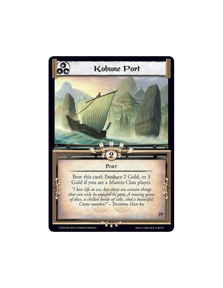 Kobune Port (Spanish)  - Port Bow this card: Produce 2 Gold, or 3 Gold if you are a Mantis Clan player.