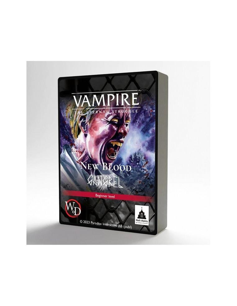 New Blood is a collection of five 55-card preconstructed decks for introductory games of Vampire: The Eternal Struggle. These decks are simpler than tournament level decks, but showcase all the basic mechanics of the game. They are balanced, for a fun and exciting first try of Vampire: The Eternal Struggle. Some of the cards included are reprints and some are new for this set, all ready to mix with cards from other sets.