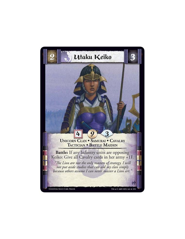 Unicorn Clan • Samurai • Cavalry • Tactician • Battle Maiden Battle: If any Infantry units are opposing Keiko: Give all Cavalry cards in her army +1F.