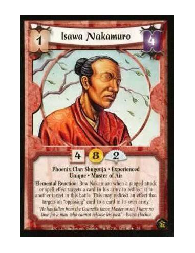 Phoenix Clan Shugenja. Experienced. Unique. Master of Air Elemental Reaction : Bow Nakamuro when a ranged attack or spell effect targets a card in his army to redirect an effect that targets an