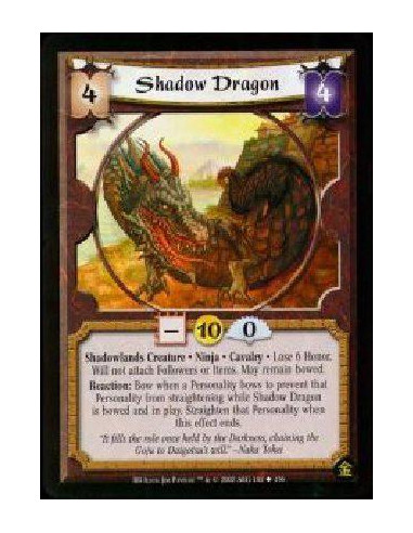 Shadowlands Creature. Ninja. Cavalry Lose 6 Honor.Will not attach Followers or Items. May remain bowed.Reaction: Bow when a Personality bows to prevent that Personality from straightening while Shadow Dragon is bowed and in play. Straighten that Personality when this effect ends.