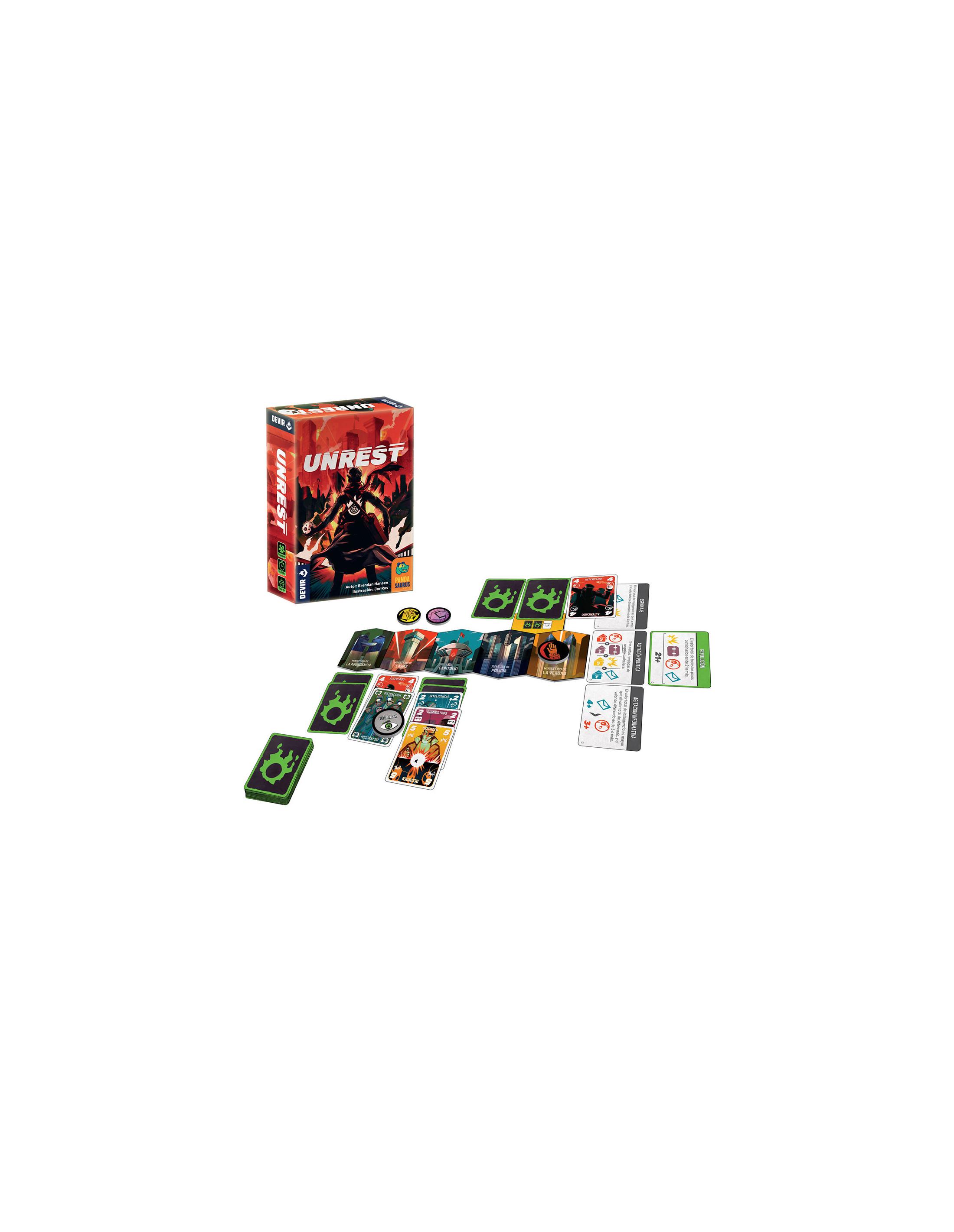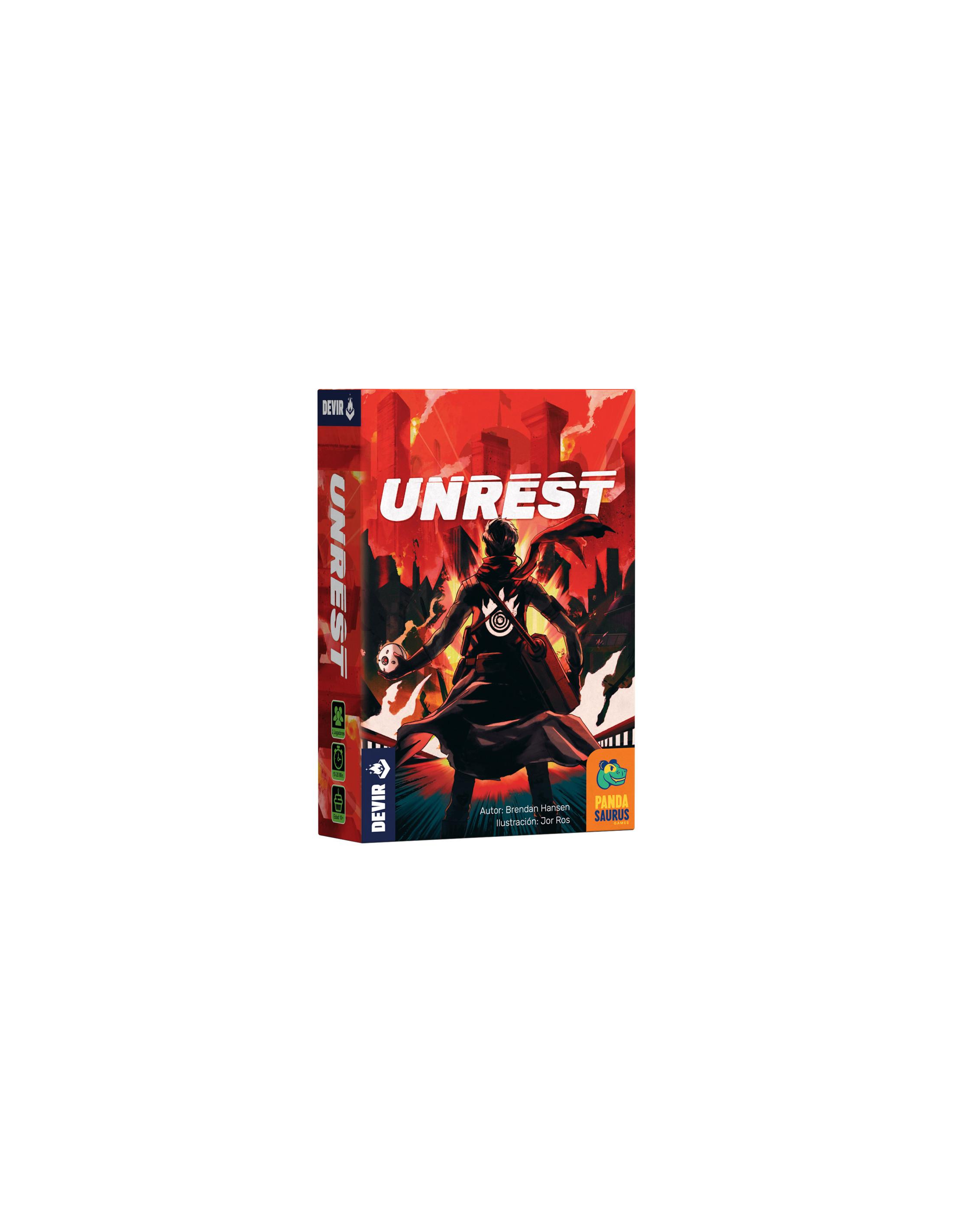 Diseñado por Brendan Hansen e ilustrado por Jor Ros, Unrest permite partidas a dos jugadores, a partir de 10 años, de unos 15 minutos de duración. A lo largo de la partida, ambos jugadores se enfrentarán cara a cara en un conflicto asimétrico por el control de cinco distritos de la ciudad.
