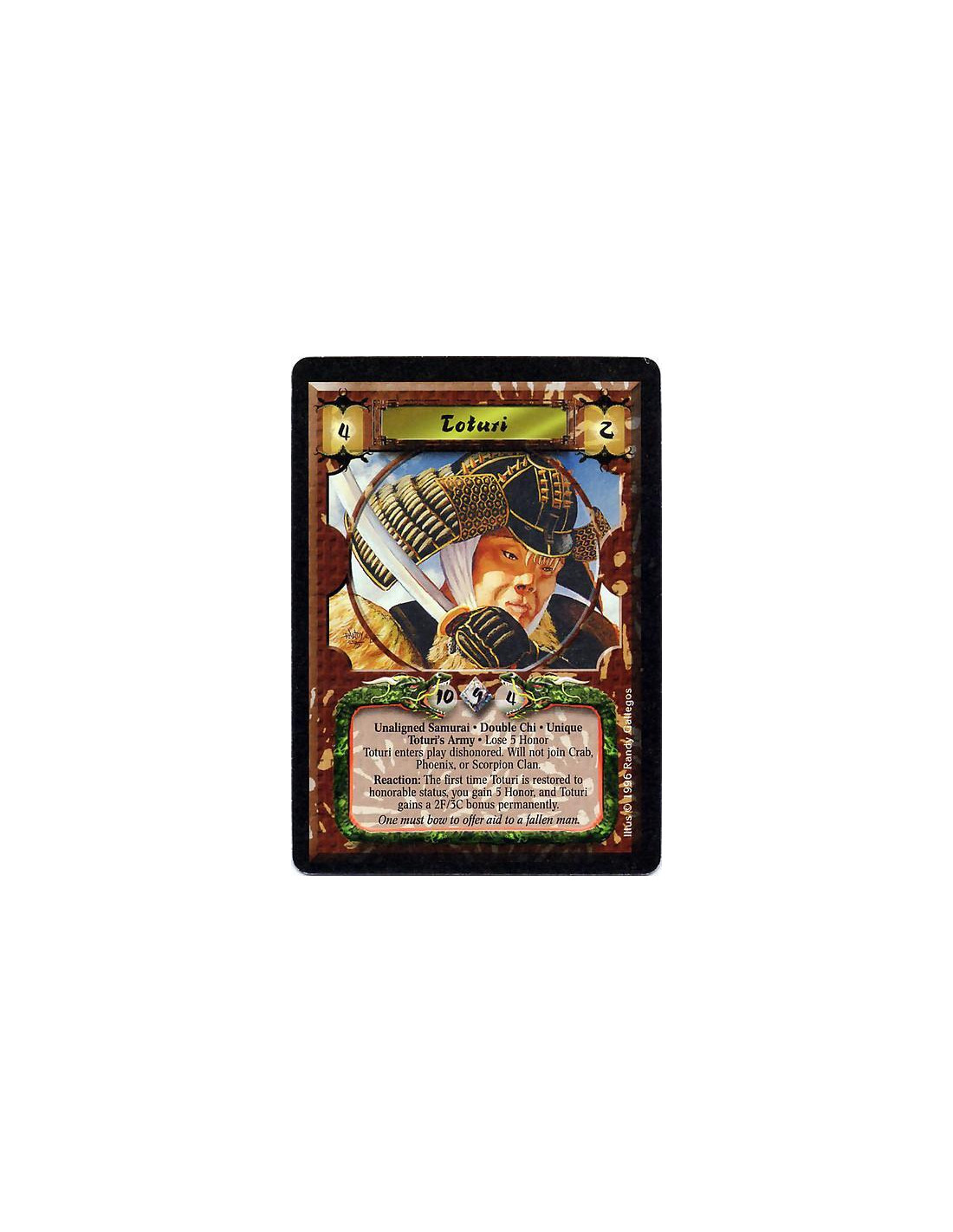 Unaligned Samurai. Double Chi. Unique Toturi's Army Lose 5 Honor Toturi enters play dishonored. Will not join Crab, Phoenix, or Scorpion Clan. Reaction: The first time Toturi is restored to honorable status, you gain 5 Honor, and Toturi gains a 2F/3C bonus permanently.