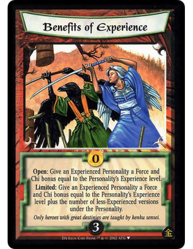 Open: Give an Experienced Personality a Force and Chi bonus equal to the Personality's Experience level. Limited: Give an Experienced Personality a Force and Chi bonus equal to the Personality's Experience level plus the number of less-Experienced versions under the Personality.