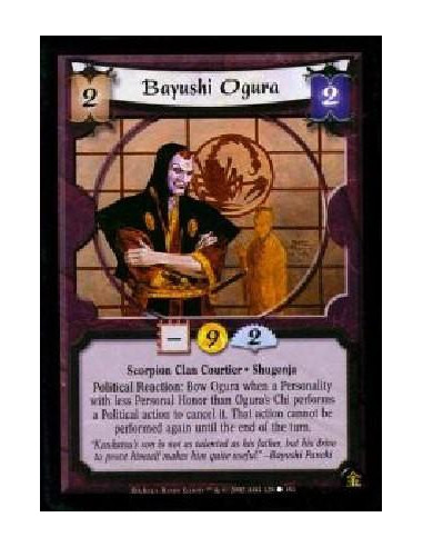 Scorpion Clan Courteir * Shugenja Political Reaction: Bow Ogura when a Personality with less Personal Honor than Ogura's Chi performs a Political action to cancel it. That action cannot be performed again until the end of the turn.