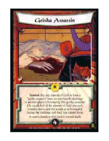 Limited: Target another player's Personality. Create a Geisha Personality card under your control with a Chi equal to half the Gold spent on this card, rounded down, who immediately issues an unrefusable challenge to that Personality. The Geisha cannot focus. Remove the Geisha from the game after the duel ends.