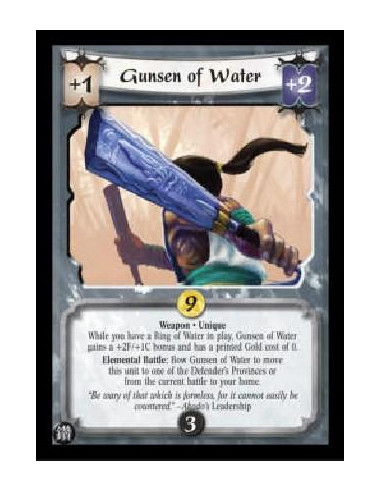 Weapon * Unique While you have a Ring of Water in play, Gunsen of Water gains a +2F/+1C bonus and has a printed Gold cost of 0. Elemental Battle: Bow Gunsen of Water to move this unit to one of the Defender's Provinces or from the current battle to your home.