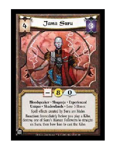 Bloodspeaker * Shugenja * Experienced Unique * Shadowlands * Lose 3 Honor. Spell effects created by Suru are Maho. Reaction: Immediately before you play a Kiho, destroy one of Suru's Human Followers to straighten Suru, then bow him to cast the Kiho.