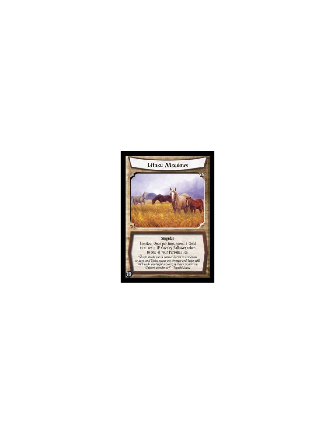 Utaku Meadows  - Singular Limited: Once per turn, spend 3 Gold to attach a 1F Cavalry Follower token to one of your Personalitie