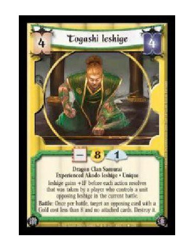 Dragon Clan Samurai · Experienced Akodo Ieshige? Unique. Ieshige gains +1F before each action resolves that was taken by a player who controls a unit opposing Ieshige in the current battle. Battle: Once per battle, target an opposing card with a Gold cost less than 8 and no attached cards. Destroy it.