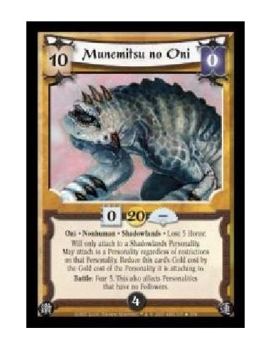 Oni · Nonhuman · Shadowlands · Lose 5 Honor. Will only attach to a Shadowlands Personality. May attach to a Personality regardless of restrictions on that Personality. Reduce this card's Gold cost by the Gold cost of the Personality it is attaching to. Battle: Fear 5. This also affects Personalities that have no Followers.