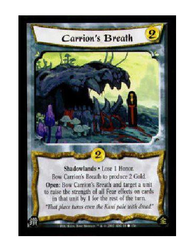 Shadowlands * Lose 1 Honor.Bow Carrion's Breath to produce 2 Gold.Open: Bow Carrion's Breath and target a unit to raise the strength of all Fear effects on cards in that unit by 1 for the rest of the turn.