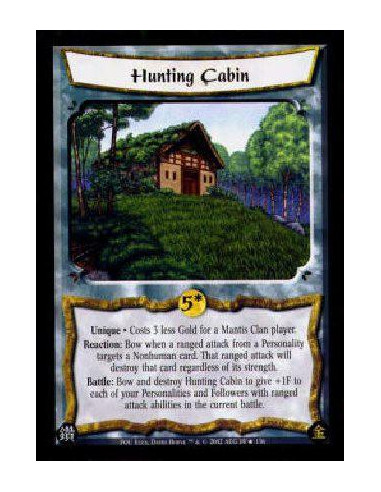 Unique * Costs 3 less Gold for a Mantis Clan player.Reaction: Bow when a ranged attack from a Personality targets a Nonhuman card. That ranged attack will destroy that card regardless of its strength.Battle: Bow and destroy Hunting Cabin to give +1F to each of your Personalities and Followers with ranged attack abilities in the current battle.
