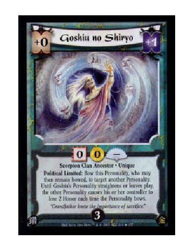 Scorpion Clan. Unique Dairu no Shiryo is considered Bayushi Dairu for uniqueness. Battle: Target an opposing Personality. The target's controller must discard a card from his or her hand. You may not target more then one Personality per turn controlled by the same player. Lose 2 honor