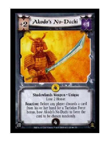 Shadowlands Weapon . Unique Lose 2 Honoir. Reaction: Before any player discards a card from his or her hand for a Tactician Force bonus, bow Akodo's No-Dachi to force the card to be chosen randomly.