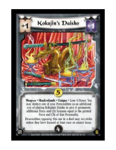Weapon · Shadowlands · Unique · Lose 4 Honor. You may destroy one of your Personalities as an additional cost of playing Kokujin's Daisho to give it permanent additional Force and Chi bonuses equal to the printed Force and Chi of that Personality.Personalities opposing this one in a duel may not strike unless they have focused at least once or cannot focus.