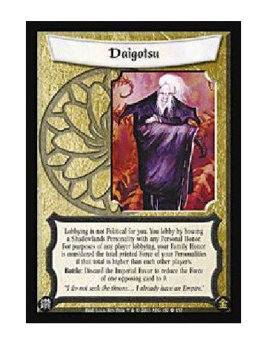 Lobbying is not Political for you. You lobby by bowing a Shadowlands Personality with any Personal Honor. For purposes of any player lobbying, your Family Honor is considered the total printed Force of your Personalities if that total is higher than each other player's.Battle: Discard the Imperial Favor to reduce the Force of one opposing card to 0.