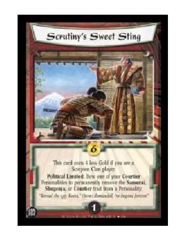 Ninja • UniqueWill only attach to a Scorpion Clan Personality. Political Battle/Open: Target a Personality: If it is a Combat Segment, bow him. If he is dishonorable, his controller loses 1 Honor.