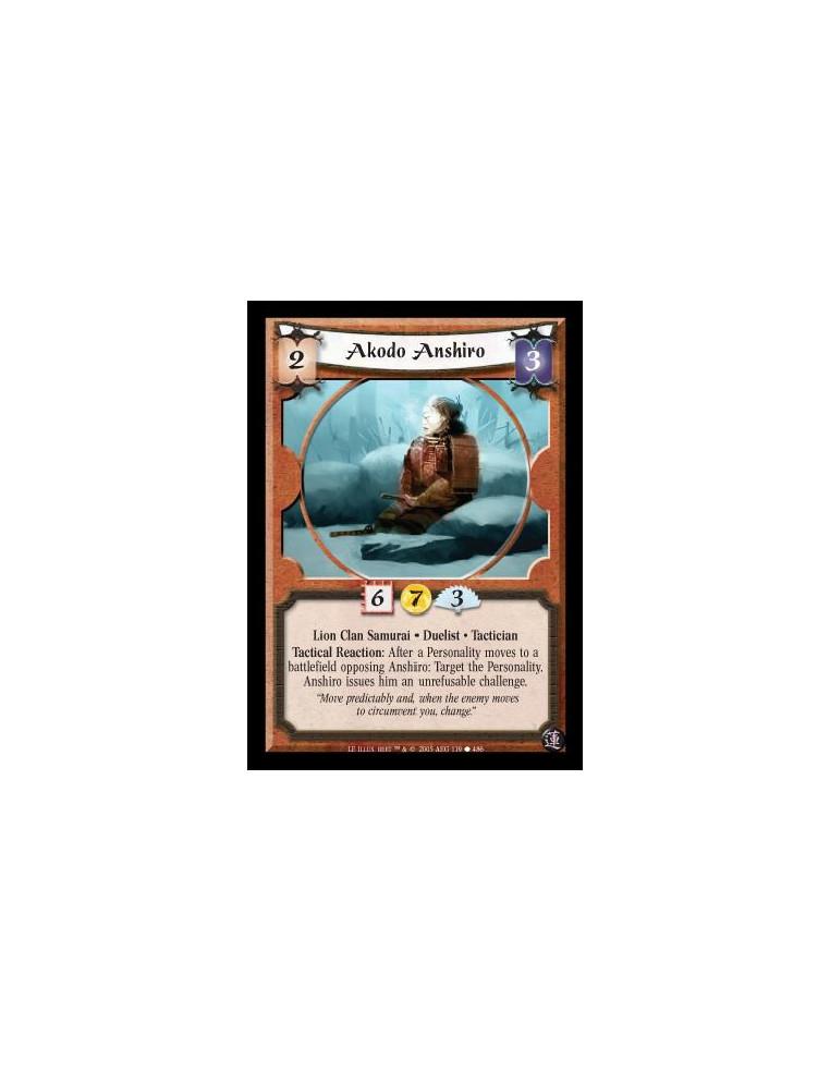 Lion Clan Samurai · Duelist · Tactician. Tactical Reaction: After a Personality moves to a battlefield opposing Anshiro: Target the Personality. Anshiro issues him an unrefusable challenge