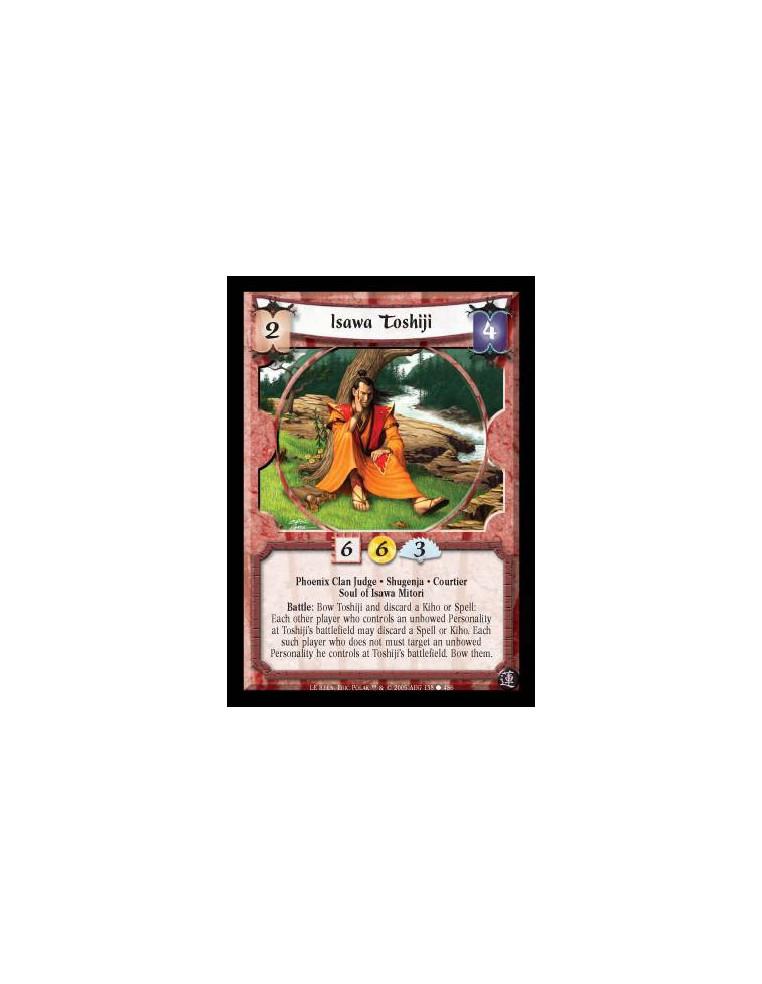 Phoenix Clan Judge · Shugenja · Courtier · Soul of Isawa Mitori. Battle: Bow Toshiji and discard a Kiho or Spell: Each other player who controls an unbowed Personality at Toshiji's battlefield may discard a Spell or Kiho. Each such player who does not must target an unbowed Personality he controls at Toshiji's battlefield. Bow them