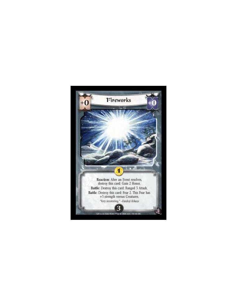 Fireworks  - Reaction: After an Event resolves, destroy this card: Gain 2 Honor. Battle: Destroy this card: Ranged 3 Attack. Bat