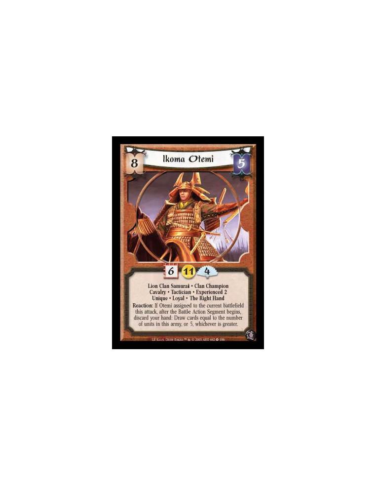 Lion Clan Samurai · Clan Champion · Cavalry · Tactician · Experienced 2 · Unique · Loyal · The Right Hand. Reaction: If Otemi assigned to the current battlefield this attack, after the Battle Action Segment begins, discard your hand: Draw cards equal to the number of units in this army, or 5, whichever is greater