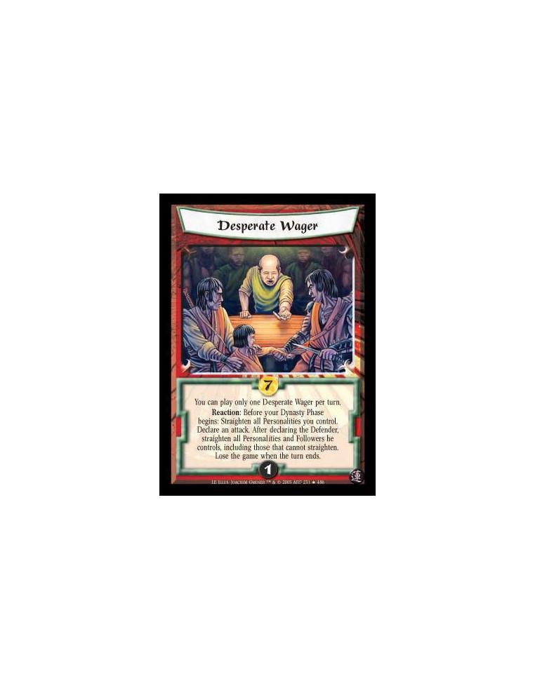 You may only play one Desperate Wager per turn. Reaction: Before your Dynasty Phase begins: Straighten all Personalities you control. Declare an attack. After declaring the Defender, straighten all Personalities and Followers he controls, including those that cannot straighten. Lose the game when the turn ends.