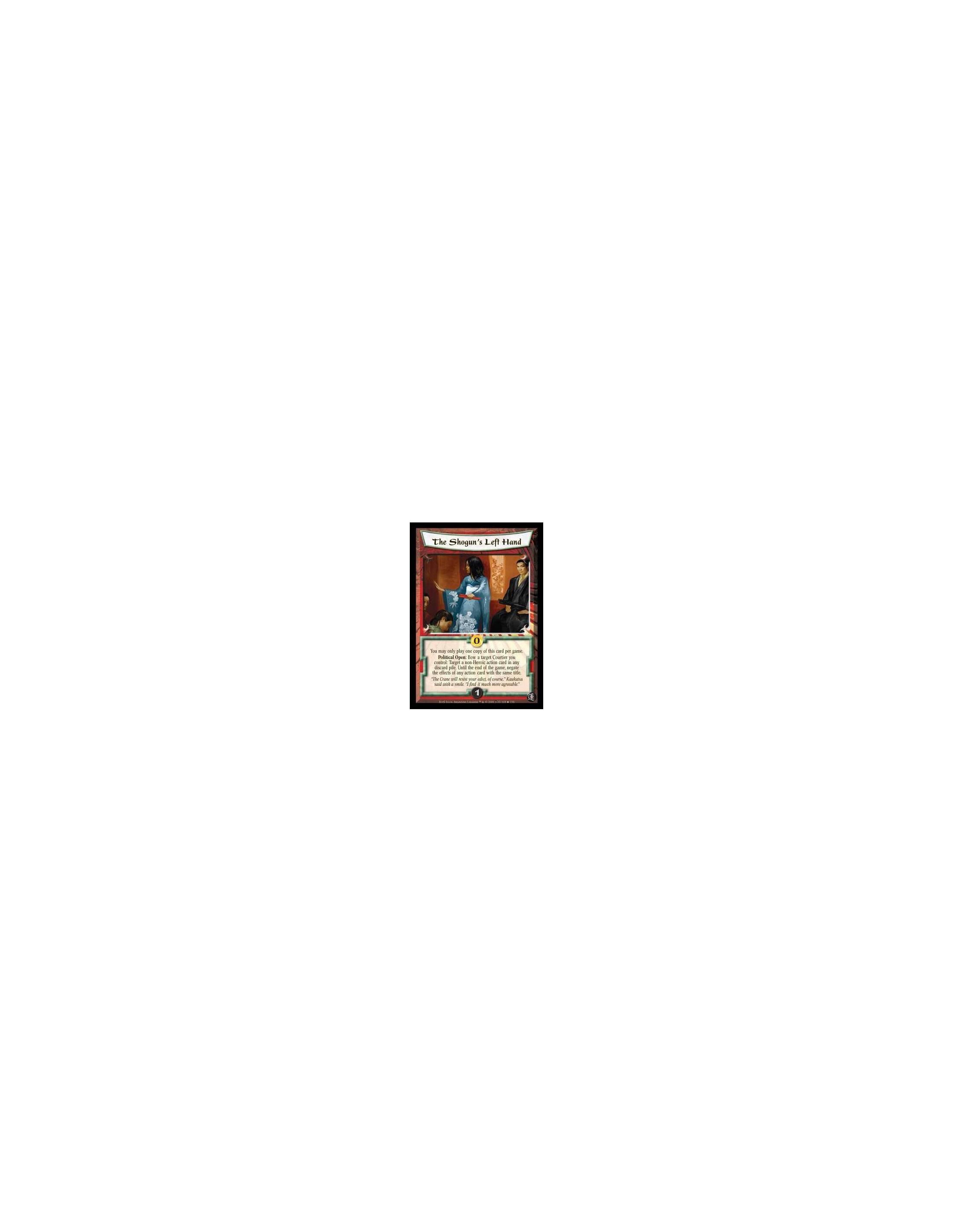 The Shogun's Left Hand  - You may only play one copy of this card per game. Political Open: Bow a target Courtier you control: T