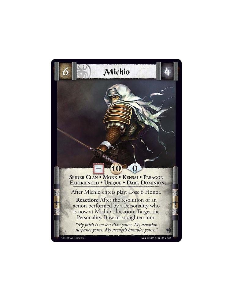 Spider Clan • Monk • Kensai • Paragon • Experienced • Unique • Dark Dominion After Michio enters play: Lose 6 Honor. Reaction: After the resolution of an action performed by one or more Personalities at Michio's location: Bow or straighten one of those performing Personalities.